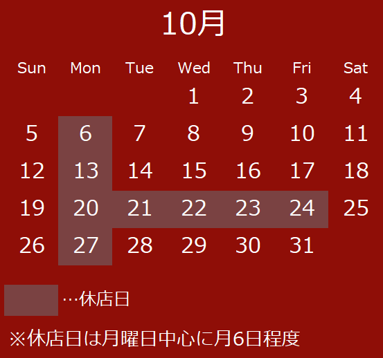 【営業時間のお知らせ】 火~金 18:00~22:00(LO:21:00) 土 17:30~22:00(LO:21:00) 日 17:30~21:30(LO:20:30) 【サービス料について】 別途10%のサービス料を頂戴いたします。